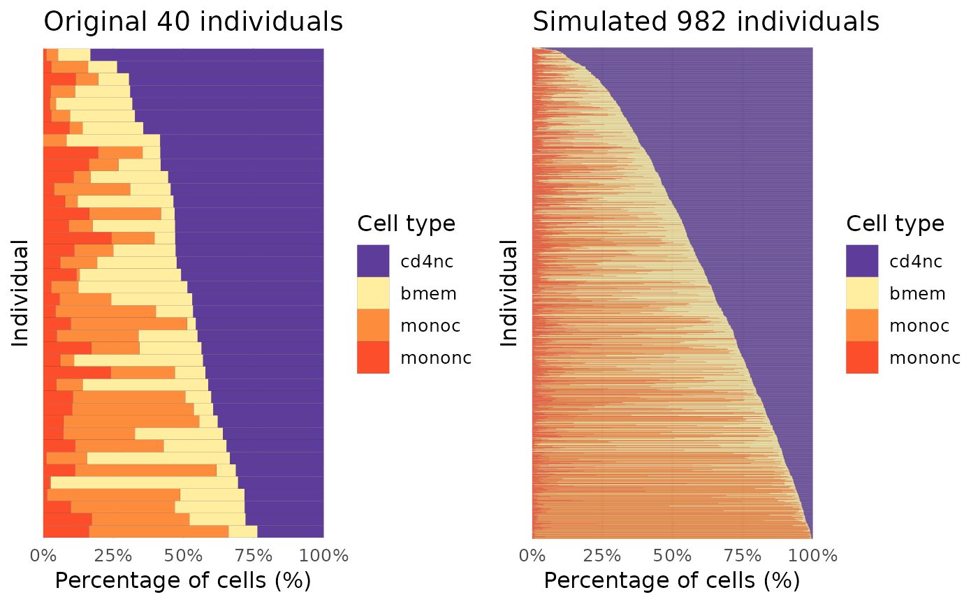 By specifying the colors for each cell type, we can visualize the cell type proportion structure between the original data and simulated data after ordering individuals with the cell number of the first cell type. If no colors are specified for cell types, the function will still plot the data using the R default colors and ordering individuals based on the cell number of the first cell type after factorizing the cell types of the given data.